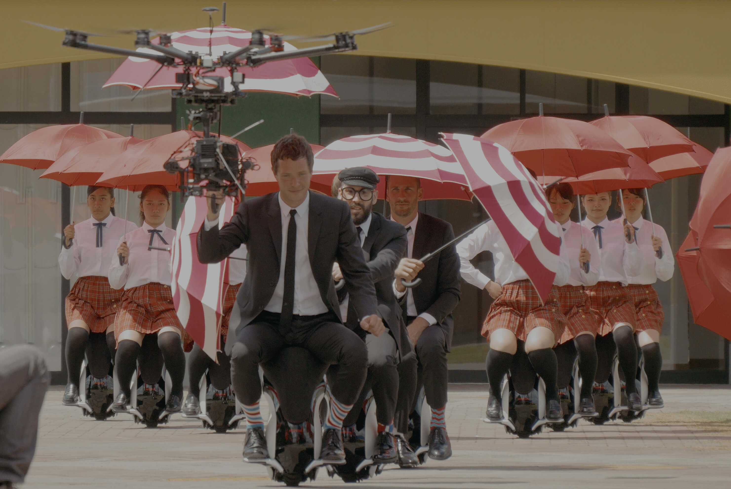 美國的搖滾樂團OK Go,熱愛以一鏡到底的拍攝手法,翻玩音樂與影像創意,打造一部部天馬行空、搞怪吸睛的MV。歌曲〈I Won’t Let You Down〉中,他們與日本導演関和亮合作,結合未來感的移動設備UNI-CUB β、和2328名手持各色雨傘的日本女孩,跟著音樂不停變換隊形,演出巨型跑馬燈般繽紛多彩的點陣群舞。