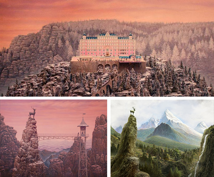 酒店模型於綠幕前拍攝,背景則是以19世紀風景畫家Caspar David Friedrich的作品,取代傳統天空和樹木背景:「作為一幅畫,它創造了一種看待世界的過濾方式。」而山丘畫作同時也沿用於酒店內部餐廳的壁畫佈置。