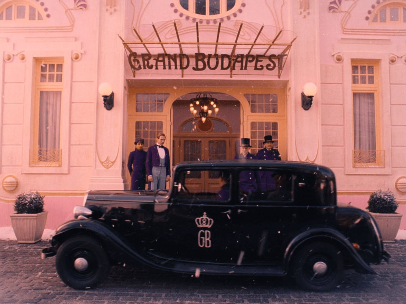 外觀設計更深受普普大飯店(Grandhotel Pupp)影響,其位於捷克卡羅維瓦立城(Karlovy Vary)的山丘上。「卡羅維瓦立城四處林立著粉色系建築,山丘上也有幾家能眺望整座城的飯店。很符合我們想營造出的電影氛圍。」