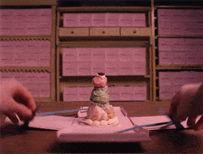 即使是看似簡單的糕點盒,也是一個艱難的把戲。當要解開藍絲帶時,必須要有人在桌面下拉釣魚線,才有辦法將盒子打開,否則盒子的兩側就會掉下來。或許正是這種老方法,才讓魏斯安德森的電影如此真實、且獨具魅力。