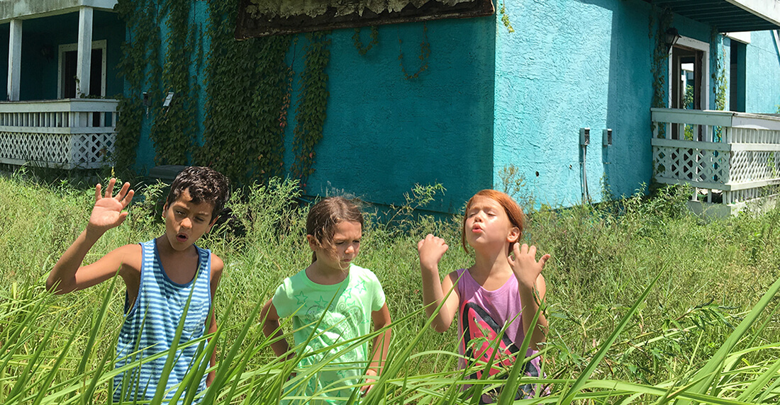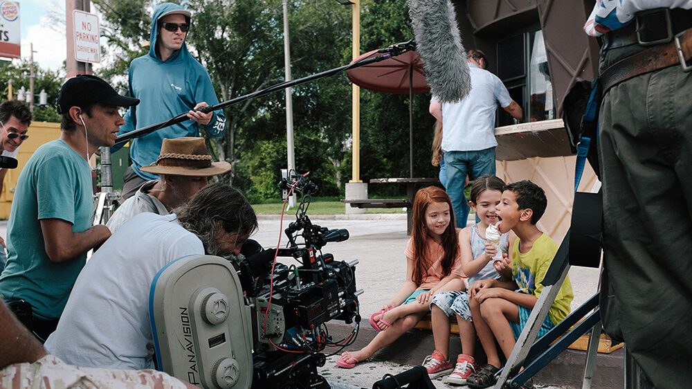 除呈現孩童眼裡的繽紛景象外,劇組更強調由孩童出發的攝影觀點。電影大量使用仰角鏡頭,保持在低於演員、或與其相同的視線。Sean Baker表示,他們常把攝影機放在推車上,讓視角放低,或在跟拍演員時使用攝影穩定器(Steadicam),能更精準捕捉表演。