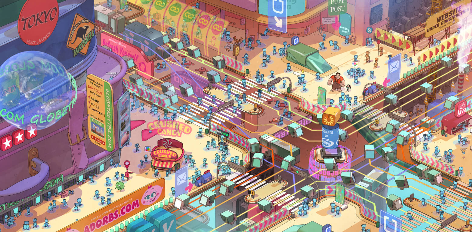 「當你瀏覽頁面、或移動滑鼠時,網路中的角色會做什麼?」Renato Dos Anjos說,他們研究了各式網站架構及設計,並以2D進行簡單測試,預測並描繪人物可能會採取的行動,藉此形塑網路世界觀的設定。