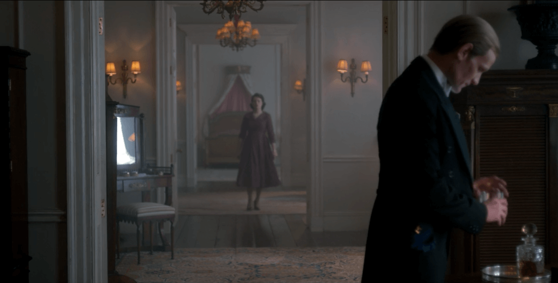 而《王冠》的場景設計,也經常利用這種層層套疊的結構,作為講述故事的重要手段。例如利用空間特性,去表現女王與其他皇室成員之間,情感上的孤立與疏離——尤其是女王與王夫的婚姻關係中,因為地位差距所導致的內心隔閡。