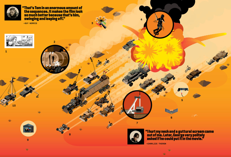 對於《瘋狂麥斯:憤怒道》背後的故事團隊來說,最大的挑戰當然就是要「化不可能為可能」。不能畫出讓觀眾不能理解的東西,也不能華麗到觀眾跟不上故事節奏。