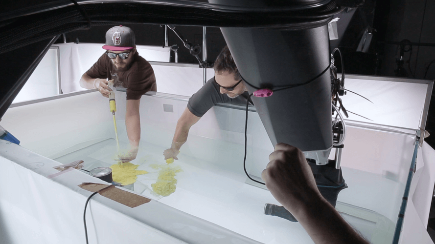 油漆以不同的壓力和速度在水中流動,呈現清晰生動的視覺畫面。製作團隊運用高速攝影機Phantom Flex4k捕捉畫面,並將相機設置在高速運動控制系統「Spike」上,利用防水電鑽(power drill submerged)製造水中漩渦,再將油漆注入進行拍攝,最後再透過Autodesk Flame處理後期的合成工作。