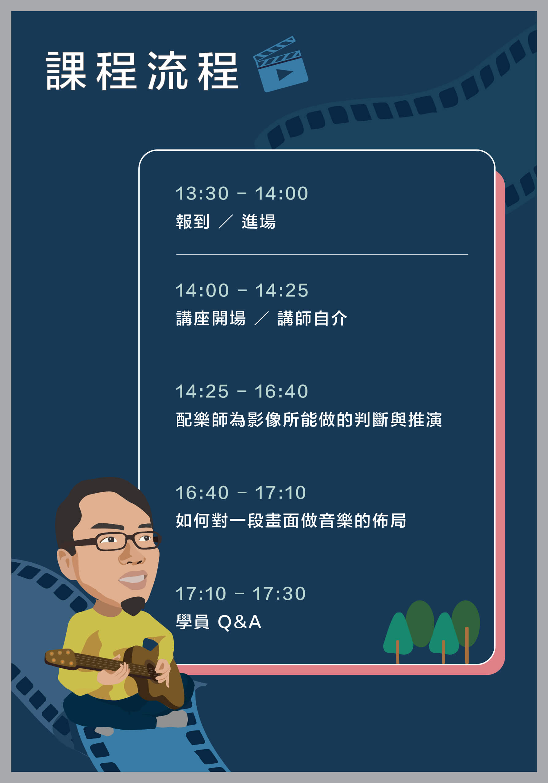 講座中,他將與我們分享自己一路走來的工作經歷,並傳授如何依據影像情緒,進行配樂風格的推演與創作,透過音樂帶領觀眾進入故事氛圍;除此之外,老師亦會分享國內外合作的經驗差異,並親自示範如何在相同影像中帶入不同類型的音樂,重新詮釋歌曲的情感與意境。