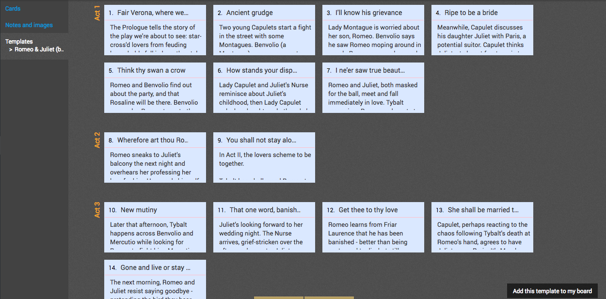 Storybuilder像是一個電子便利貼板,可以讓你寫出你的故事需要幾幕劇,也提供樣板供你參考:如莎士比亞的羅密歐與茱麗葉,讓你注意到三幕劇,分別需要幾個故事橋段來達到轉折跟鋪陳。