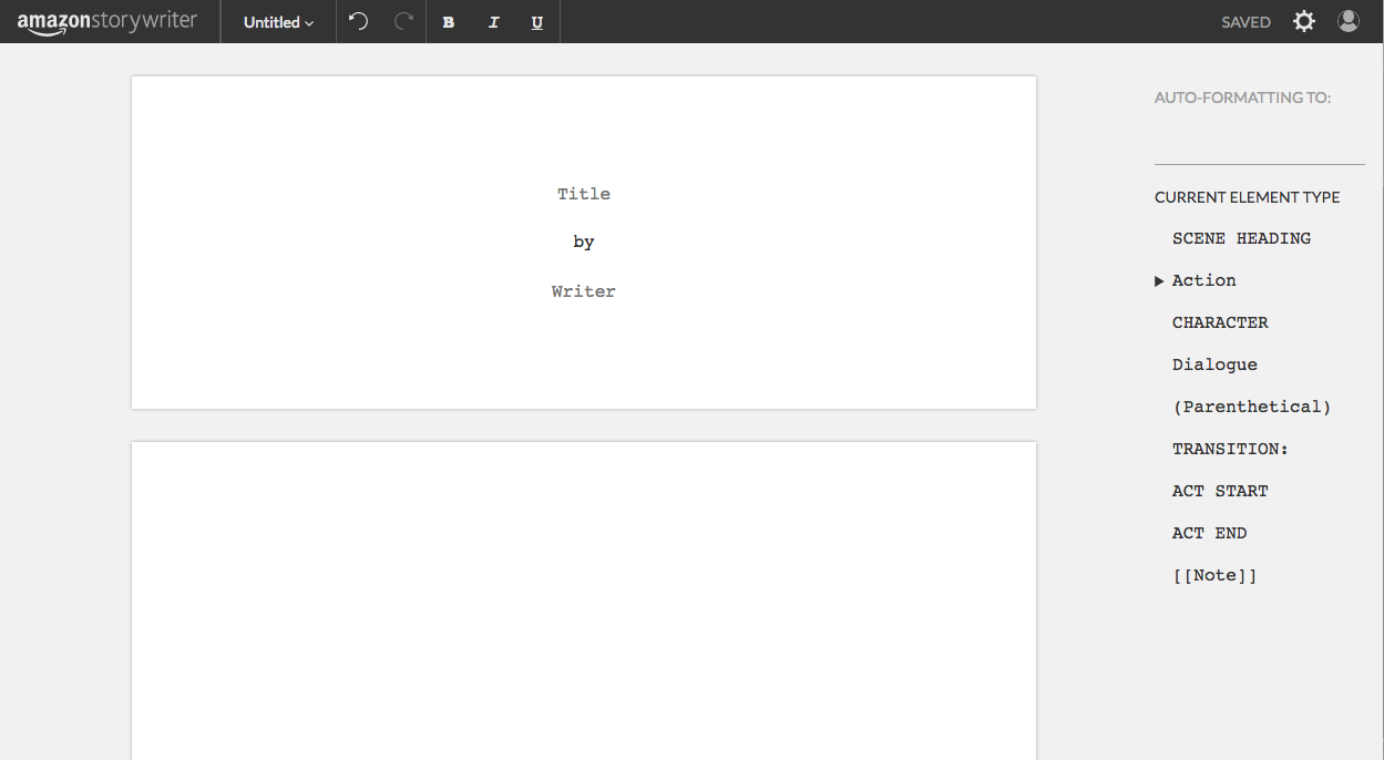 在Amazon Studios的官網上,進入Storywriter頁面,直接登入就可以使用它的網頁編寫劇本:場景、動作、角色描述、對白、轉場……,你點了選項,格式自動幫你調到固定的位置方便你打字,隨時可以儲存,可以輸出,可以繼續編輯——可以上交給Amazon Studios。