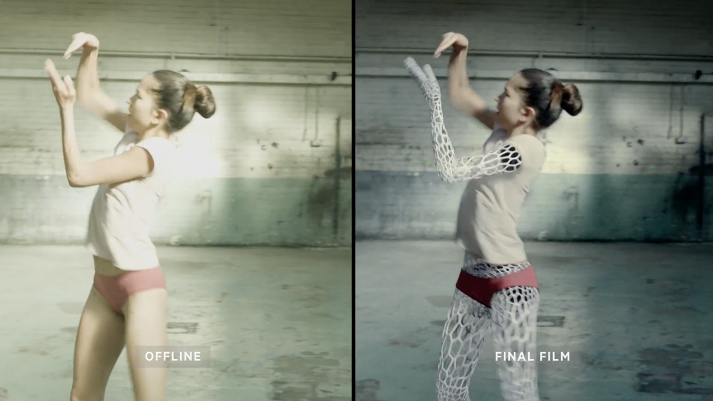 事實上,舞者大部分的緊身褲與部分衣服,也是 CG 與實拍素材合成,這樣的做法讓衣服跟鏤空身體更加貼合,但為此後期團隊 The Mill 也需要額外設計服裝陰影與突出的部分,以呈現身體自然的輪廓樣貌。
