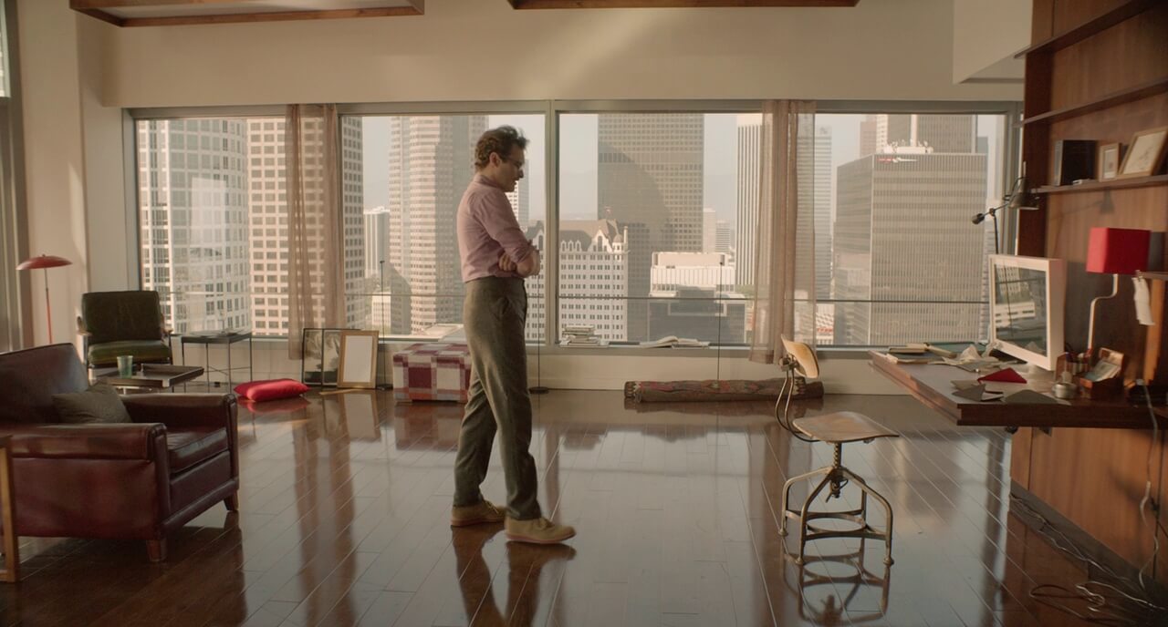 剛離婚的西奧多花很多時間待在家裡,諾大的公寓空間代表著他內心的孤寂。Barrett在洛杉磯市中心找到一間空屋,可以透過大片玻璃窗眺望美麗景色,為了反映更多城市景象,而將實木地板打蠟使其更顯光澤,並設置木製的復古傢俱,圍塑溫暖木質氛圍。