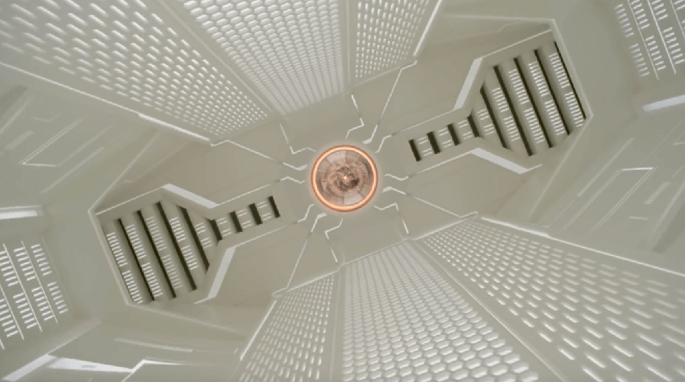 拍攝太空梭空間時,攝影指導 Alexis Zabé則使用搖臂(Crane),以穩定速率前進並旋轉攝影機:「它的運鏡變得極具機械感、非常精準,就像失重一樣。」彷彿承載著觀眾,前往時空旅程的終點。