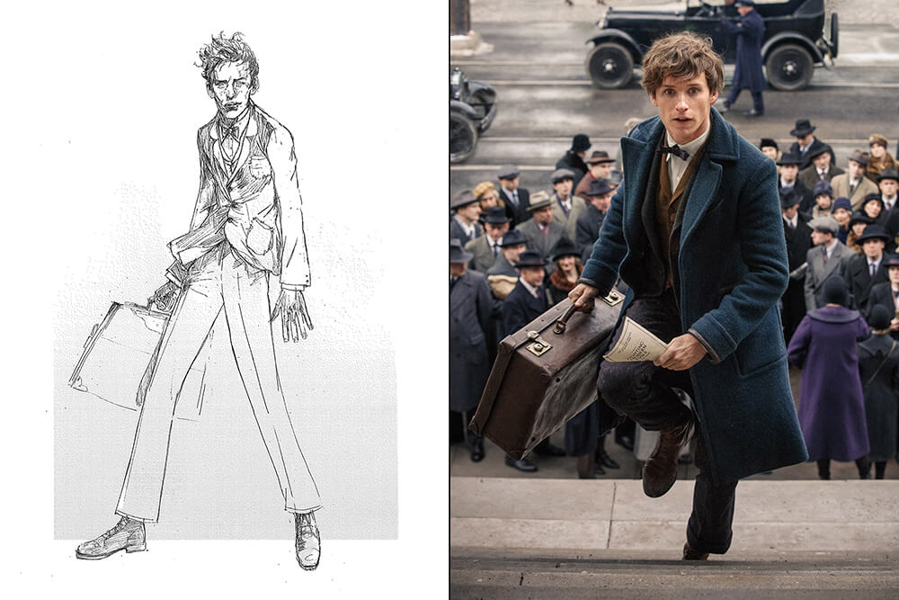 她刻意將西裝剪裁得較不合身,褲子也較短,凸顯紐特的與眾不同。為符合他親近自然的形象,柯琳從電影中的奇獸獲取靈感,利用以前曾使用過的復古布料,親自染製出「孔雀藍」的美麗色調。「某種程度上,紐特就像一隻鳥,或是皮箱裡其中一隻珍奇異獸。」