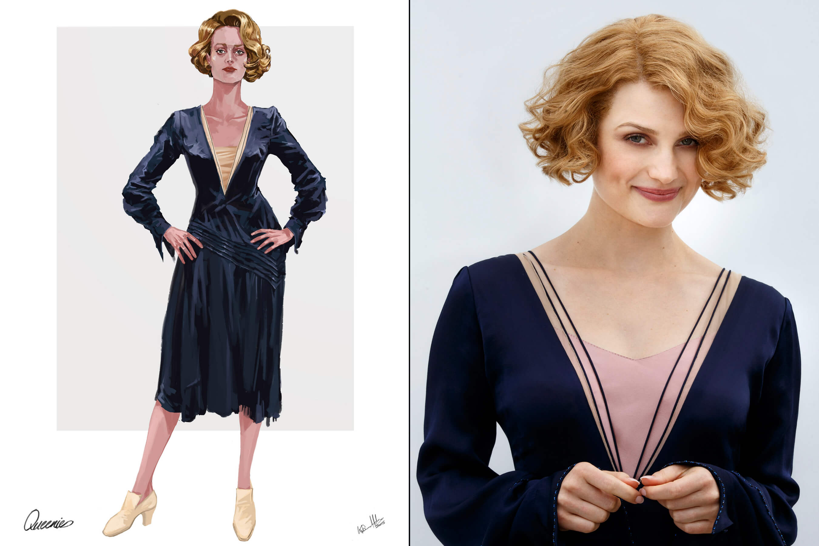 「蒂娜是一名現代女性,我從一開始就決定給她穿著褲裝。」姊姊蒂娜的個性實際、獨立,較具男子氣概,為彰顯她的俐落與能幹,柯琳選擇以當時較不普遍的褲裝為主,並透過柔和、涼爽的色彩與暖灰色調呈現。