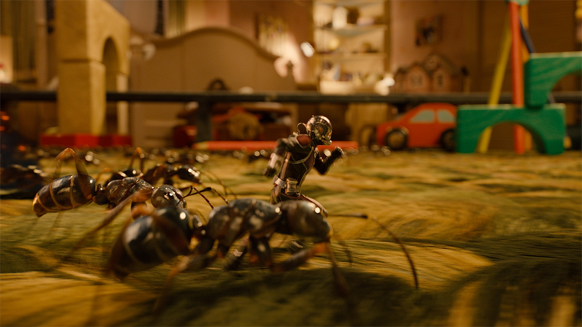 「我們在攝影控制系統 (Motion control) 上,安裝了Alexa XT相機,並使用Frazier鏡頭,獲得極具景深感的影像。」視效總監Jake Morrison說:「在這些鏡頭中,我們皆採用了大景深效果,讓觀眾看見蟻人所處的環境。」他希望能透過Frazier鏡頭,使主體、前景和背景的物體同時保持清晰,重現其細節,再於後期調整景深範圍。