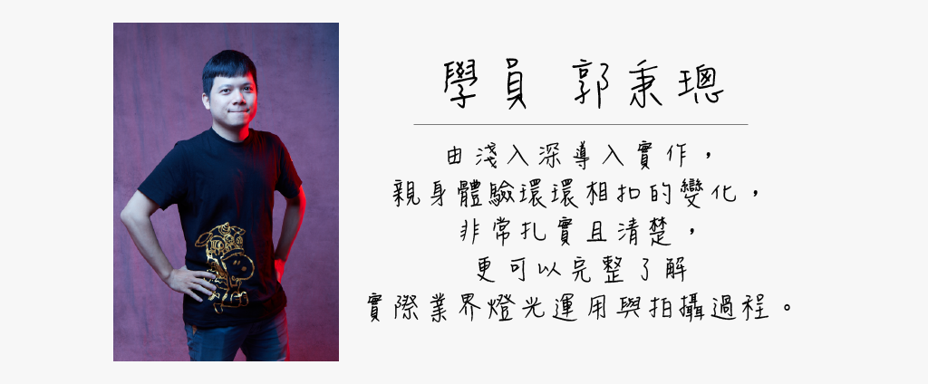 川宏老師也分享拍攝人像時,業界較常使用的打光方式,並以「一支燈」為基礎,運用前頂光、林布蘭光等光法,讓學員在實作練習中互拍學習。他也提醒,光線要隨著模特兒的氣質調整,以轉換「光質」的手法,去呈現他的性格。「打光是不能只把燈放著,每張人臉都各有特色,都有自己的特質,必須學會在現場觀察調整。」