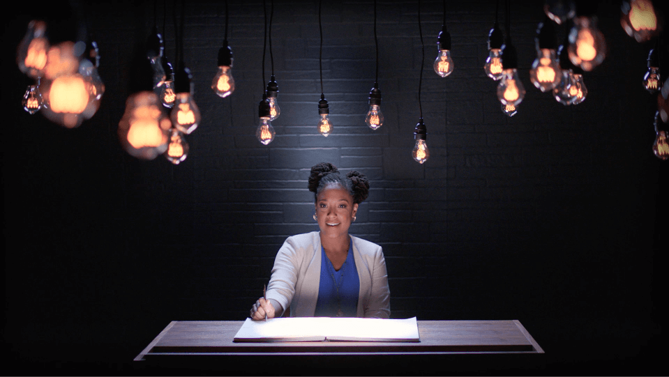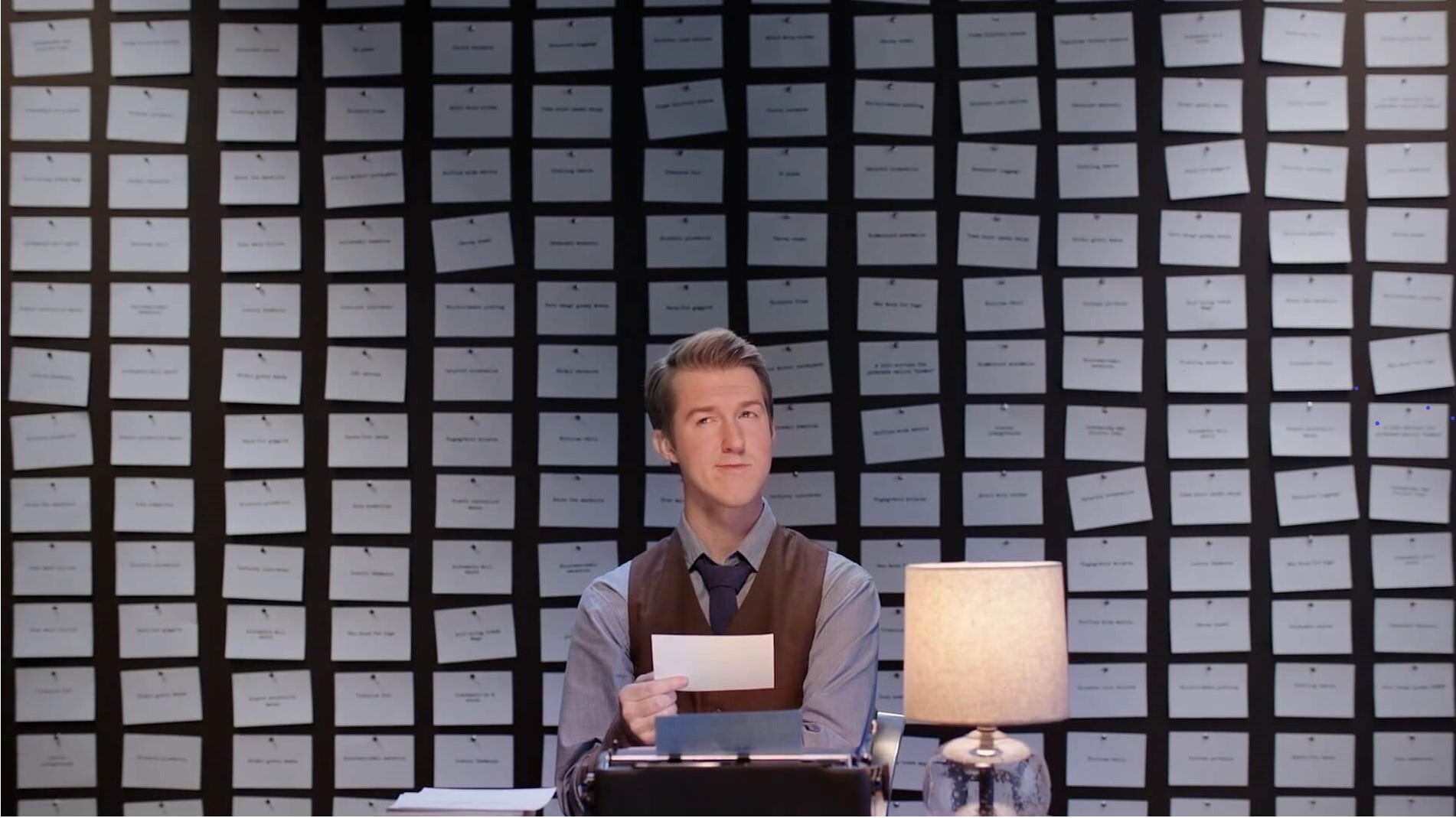 一名女子端坐在書桌前,腦中閃過千百種念頭,點子像老式卡通般,點亮頭頂的燈光;男子於打字機前思索,鏡頭緩緩拉近,移動至背景佈滿整齊排列、貼滿整牆的便條小紙卡;另一支影片,攝影機從高空中拍攝,張張寫滿註記的餐巾紙,如鮮花般飄散在女子身上。