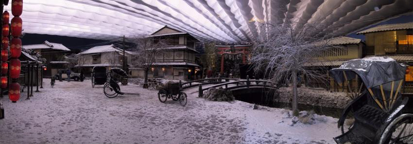 「我們去了祇園、主要茶館和藝伎學校,還看了歌舞伎劇院,並走訪京都各座寺廟和神殿。」Beebe提及他的日本之旅,但結果卻事與願違。「現在的京都,充滿了電線和現代建設,已無法作為電影拍攝地點。」且考量日本拍片的諸多限制下,製作團隊最終決定轉至加州拍攝,依自身力量「重建」當時的祇園外觀。