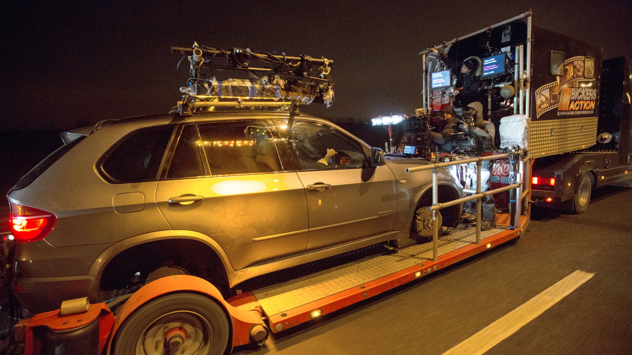 例如,電影《失控》(Locke)的故事場景,幾乎都發生在演員Tom Hardy駕駛的車輛上,而拍攝過程即使用合成式拖車完成。導演Steven Knight先將被攝車輛放置在攝影平台上,再將它的輪子拆除,使其更接近正常行駛時的高度,打造安全又真實的車輛駕駛場景。