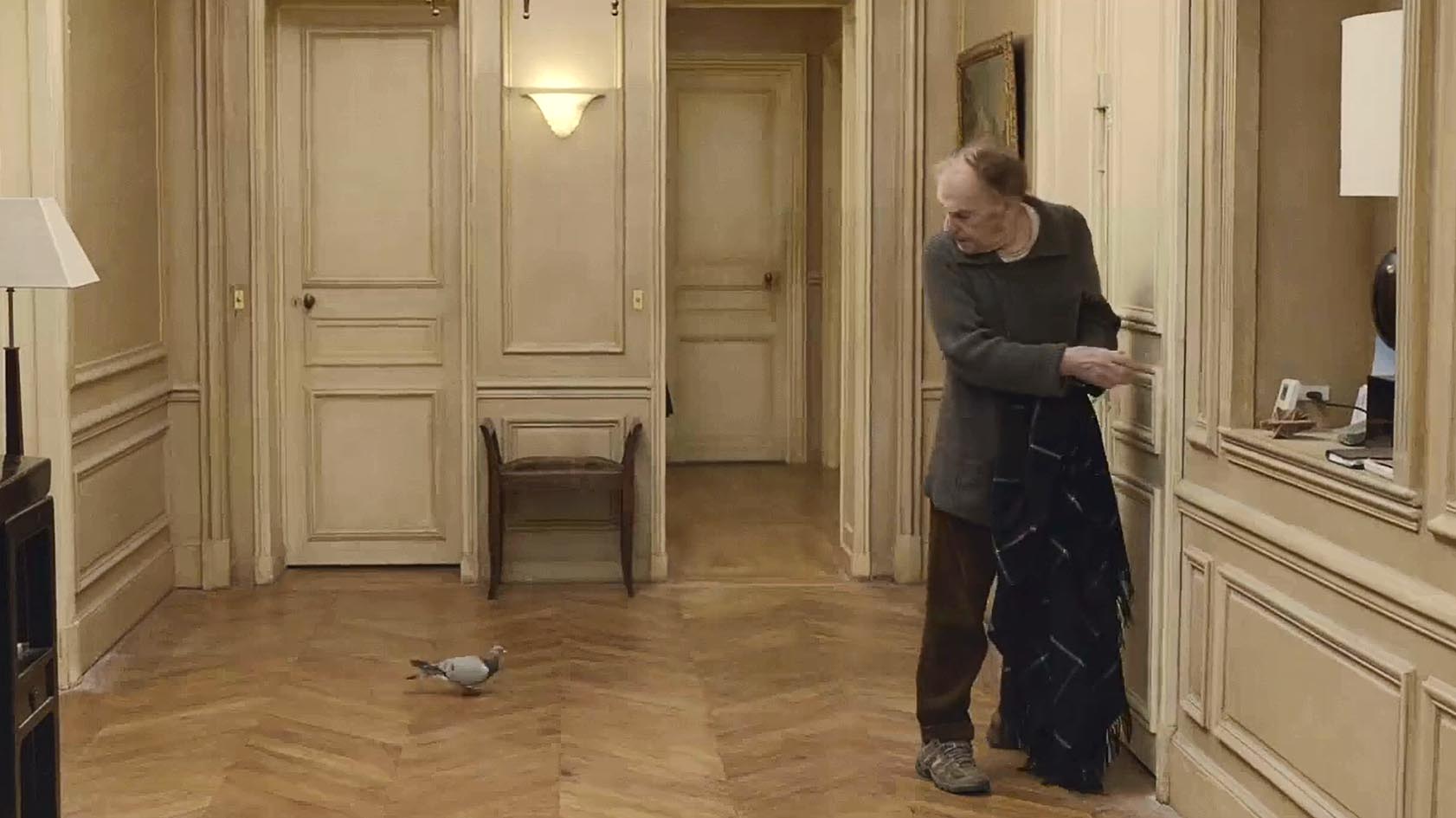 在《愛‧慕》電影結尾,有隻鴿子飛進了主角喬治的家,為了不讓鴿子亂跑,喬治拿著黑布,小心地跟在後頭,晃了幾圈之後,終於把鴿子捉住……儘管這個場景看似簡易,但當初導演Michael Haneke(麥可漢內克)為此共拍攝了12次之多,對演員Jean-Louis Trintignant來說,更是一場挑戰。。