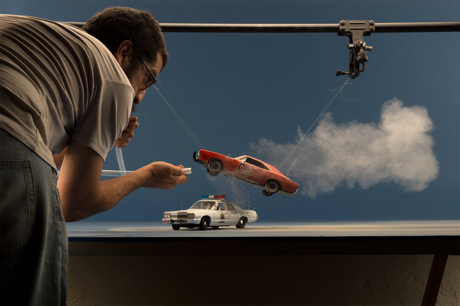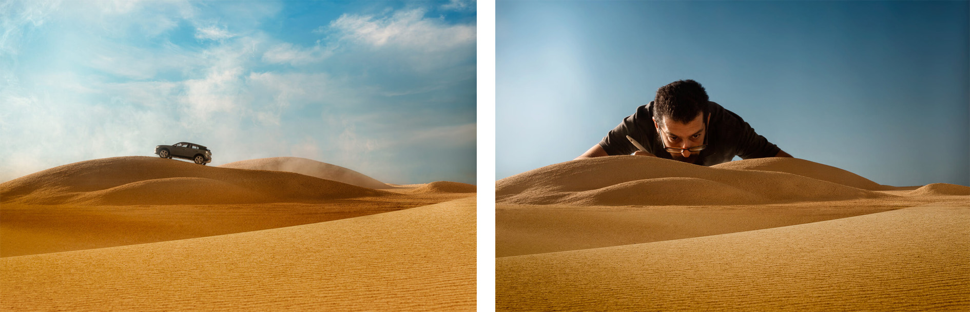 Felix Hernande花費兩週時間,於攝影棚內打造三個微型場景,作為此次廣告拍攝的舞台。他不僅用風扣板(Foam Core)、LED燈、砂紙等素材,鋪設出縮小版的汽車公路,更以加水拌合的細緻粉末(Polvo Fino),精心形塑連綿沙丘與風痕紋理,重現杜拜壯麗的沙漠風光。