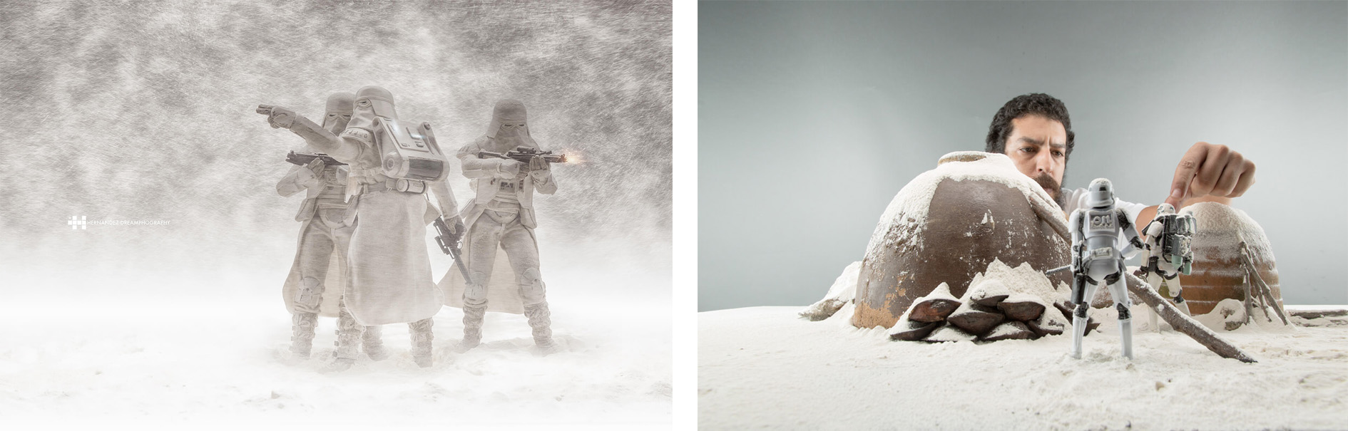「拍攝微縮模型的方式,和一般攝影的原理沒有太大區別,但仍然有其特點。」Felix Hernande指出,你必須以大尺寸進行設想,並思考如何用小尺寸加以實現。例如拍攝「星戰系列」時,他會假想自己就是帝國風暴兵、身處幻想中的場景,在鏡子前擺出各種姿勢作為參考,使陳設的畫面看起來更加自然。