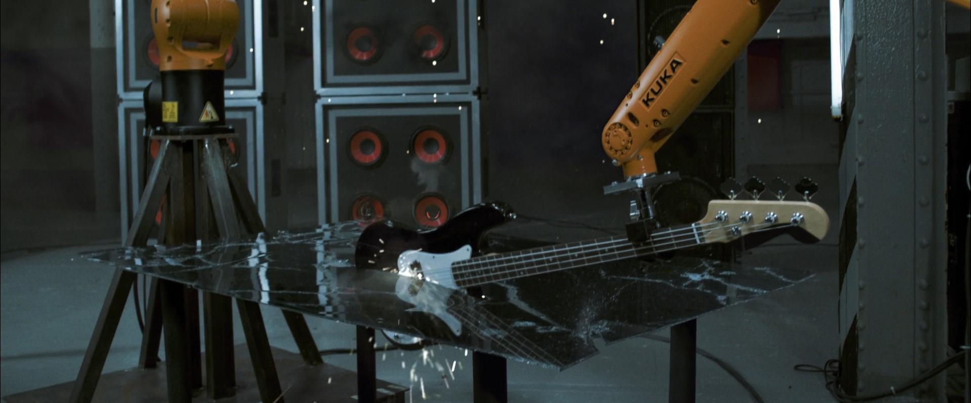 由於機臂無法快速重擊貝斯,拍攝時需先移除桌子,僅拍攝機臂緩慢控制貝斯,移動至地板的畫面;而後再將桌面移回原處,以系簧槍(Captive bolt gun)射擊,並使用Phantom Flex攝影機、以500 FPS捕捉爆破場景,並後製將兩顆鏡頭融合。