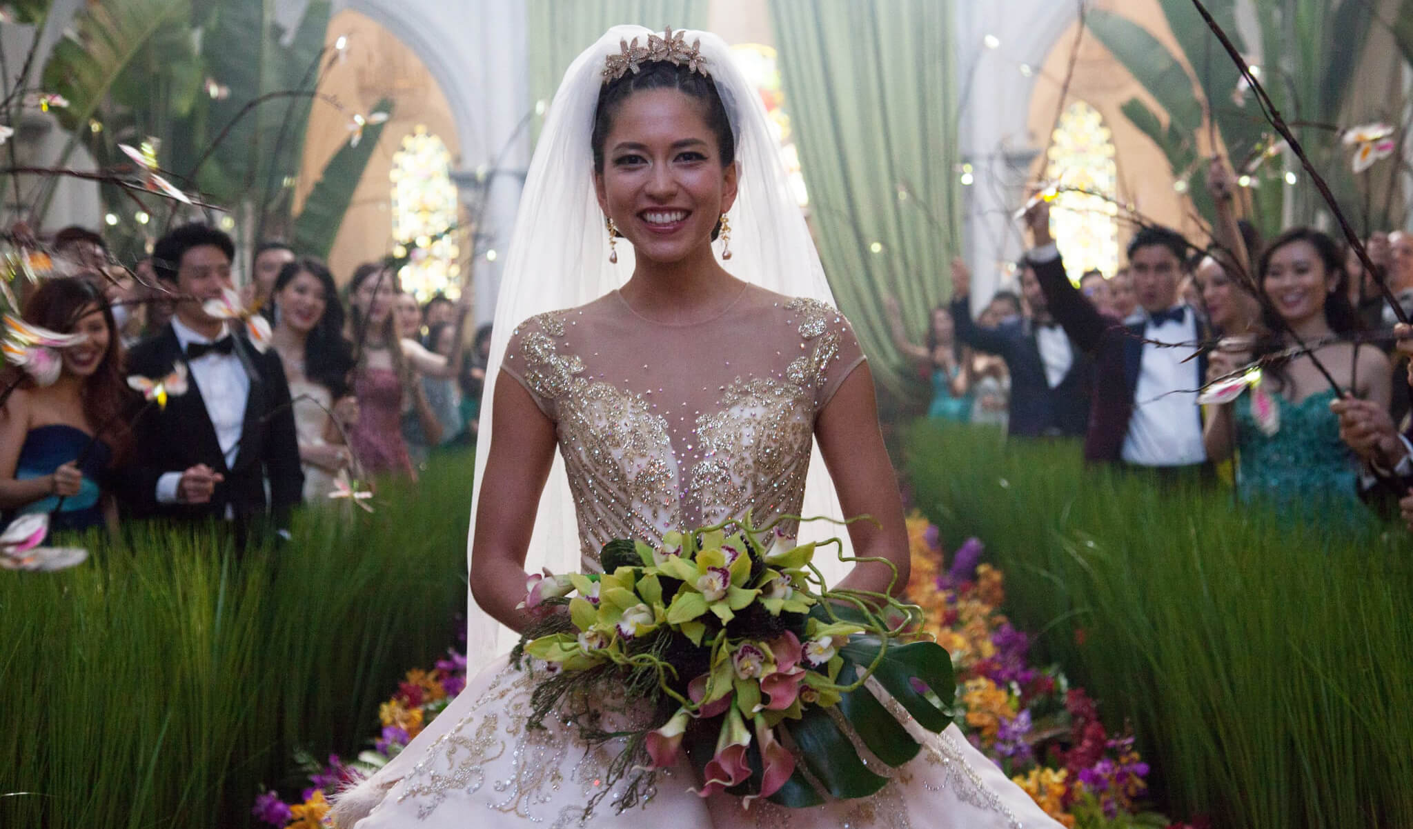 「只是在教堂裡塞滿鮮花,並不能使這場婚禮顯得獨一無二。」藝術指導Nelson Coates發揮創意,在新加坡市中心的CHIJMES教堂內部,打造出一座充滿亞洲風情的熱帶花園。然而,植物遍地的花園設計,卻也替拍攝過程更添挑戰——畢竟在一個到處都是半人高草叢的地方,劇組和器材幾乎寸步難行。