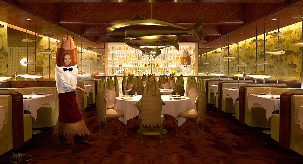 「這家餐廳的所有裝飾,都和鮭魚有關。」Welch解釋,從鮭魚椅背到鮭魚壁紙,所有的傢俱都是特地訂製,甚至連服務生賴瑞身上的「鮭魚衣」也是。「我想把主題餐廳的想法,推到荒謬的極致,看起來又不失真實性。」