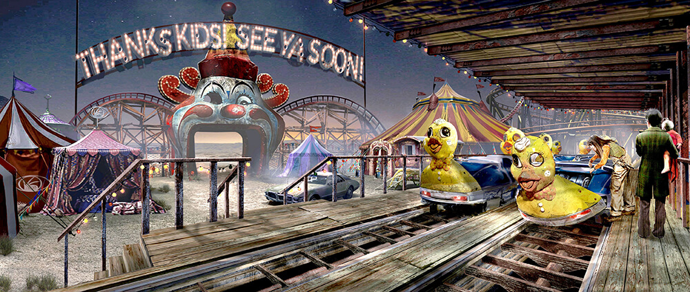 一坐廢棄遊樂園,似乎為波特萊爾家的孤兒們,增添更多不幸、悲慘的氛圍。Welch利用損壞的過山車及瘋狂小丑臉,表現樂園年久失修、門口羅雀的情形。他補充:「小丑的笑容雖然不詳,但仍能作為進入嘉年華華麗世界中的象徵。」