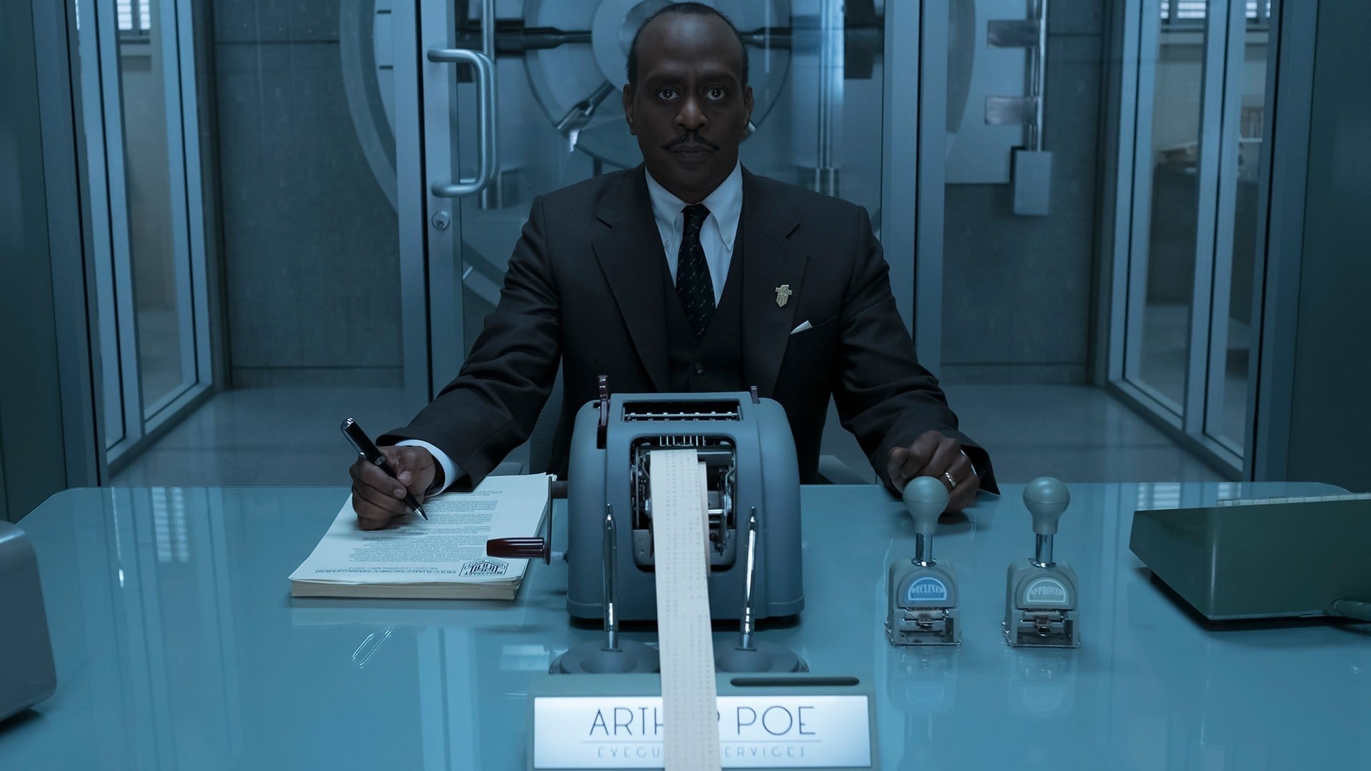「這是一名孩子認為辦公室應該有的模樣。」Welch將辦公室壓縮成狹長型,在牆上裝滿文件櫃,並透過銀、灰、白等冷色調呈現。他解釋,設計成南北軸向非常適合拍攝,畫面呈現更為對稱。