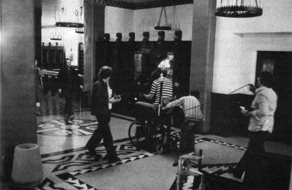 The Shining 鬼店》當中有許多主角們走在空無一人的旅館內的畫面,攝影師也是坐在特製輪椅上面扶著攝影機跟拍,才能維持移動的靈活度,又能達到跟拍的效果。