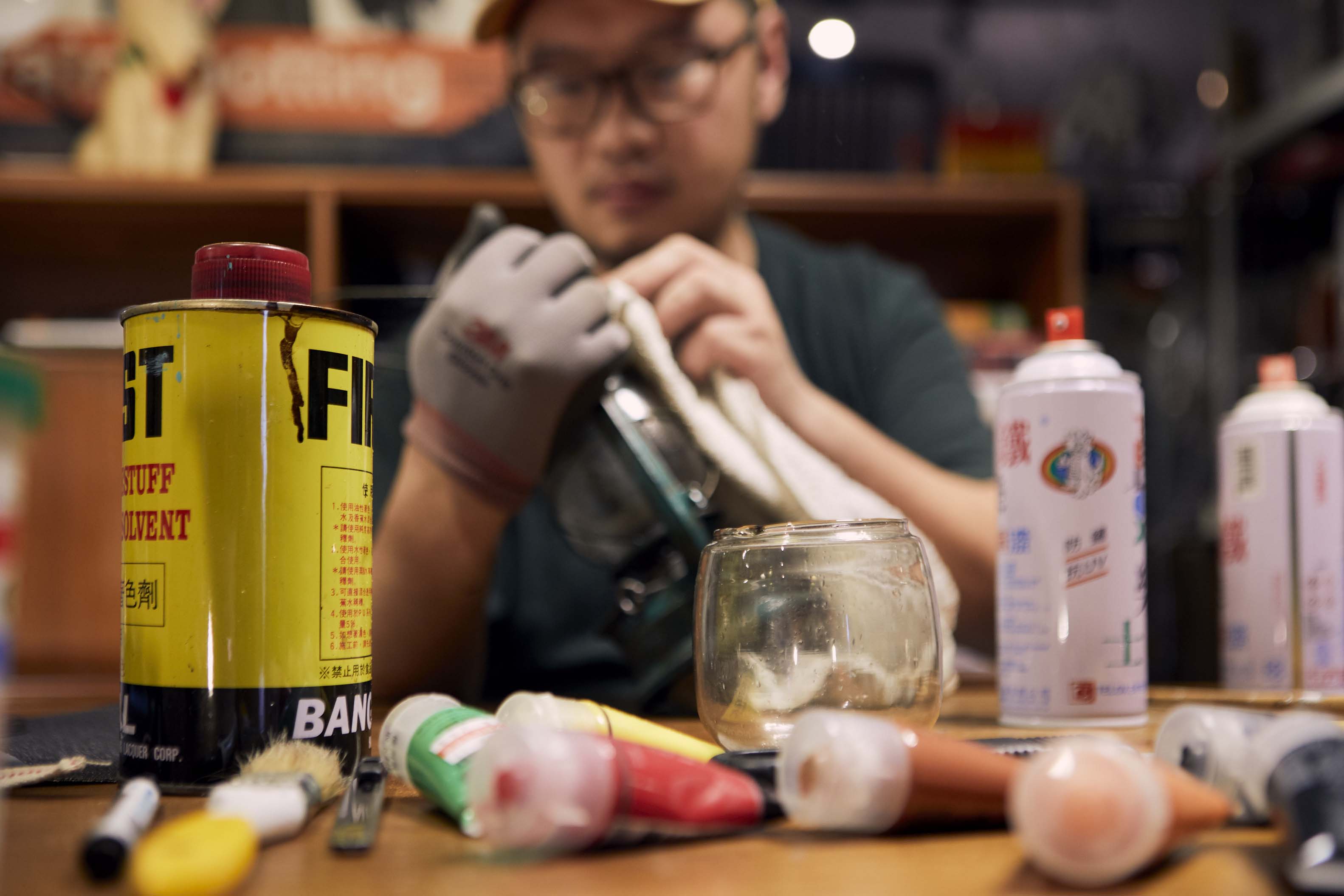 分享製作質感的訣竅,他說,須仔細觀察平常不易察覺的細節:「我們會在你常使用到的地方,加上一些髒髒、舊舊的生活感在裡面。」比如在電燈開關與生鏽窗框的邊緣,以油漆粉刷、噴漆等方式,增添其摩擦痕跡及壁癌質感。有時「海綿」也為便利工具之一,其紋理能做出掛畫背後的斑駁印痕,增添層次,呈現老宅悠久年代之感,營造出「家」的氛圍。