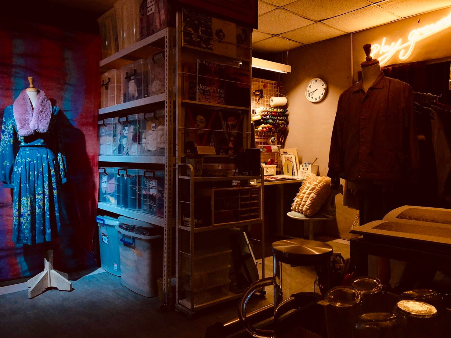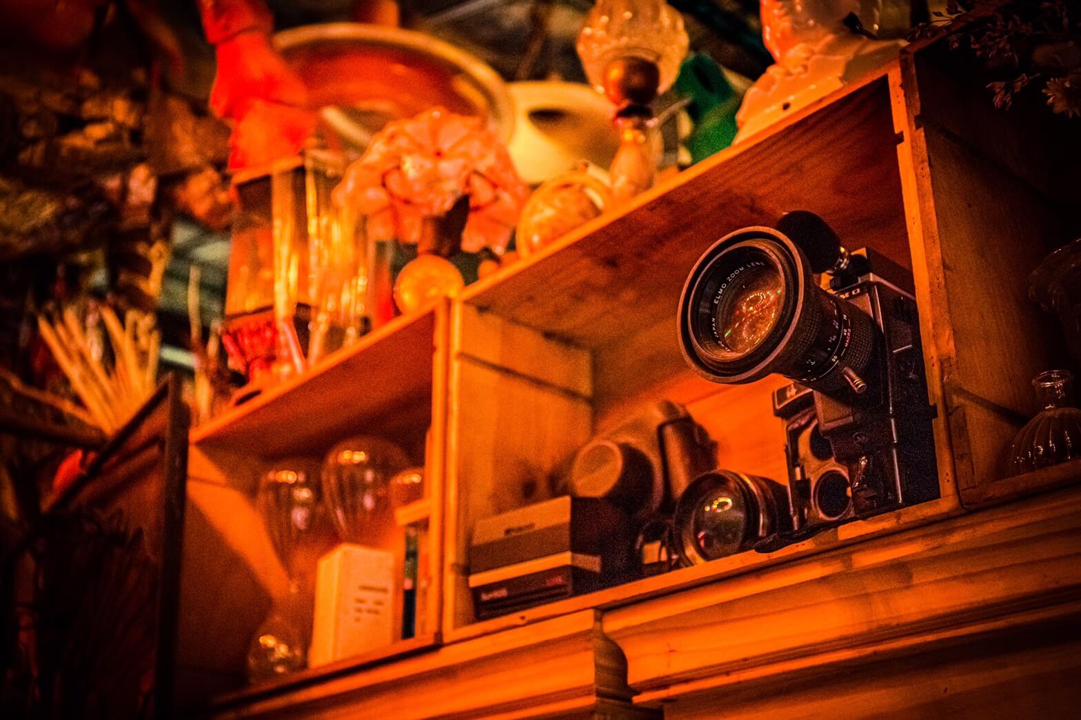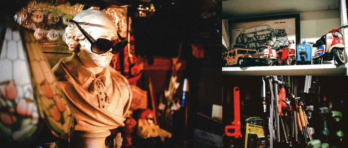 碩大的AF倉庫中,所有道具按照不同類別,井然有序地呈現在眾人眼前,唯獨一間小房間裡的物品陳列,倒像是經人悉心裝飾,擺放許多復古細緻的擺飾,彷彿走進一個被世界遺忘的時空。小豬感性地分享,他蒐集的道具,大致可以分成紀念性蒐藏品,與重複利用性高的佈景道具,擺放在這間房間的物品多是他過去拍片有著回憶的東西。