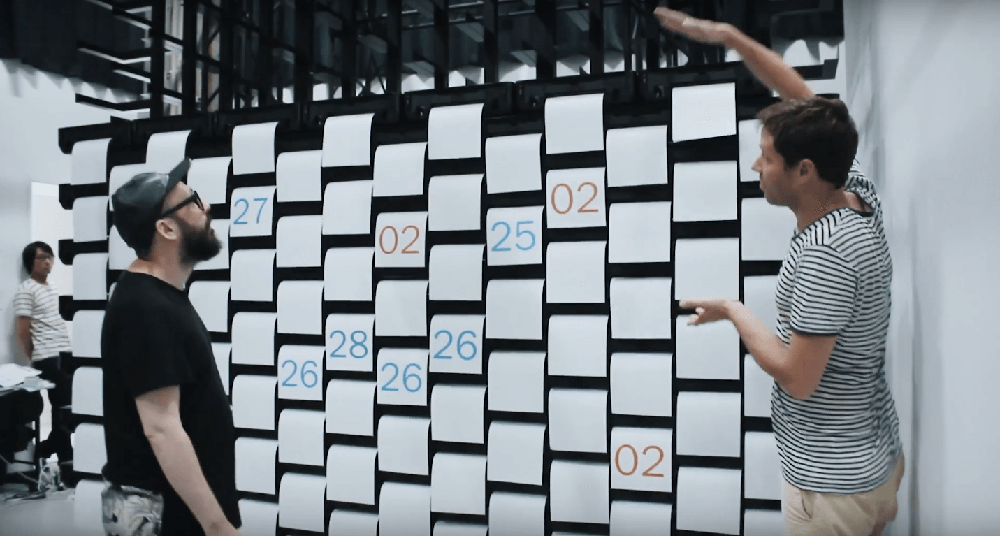 不同於數位影片,紙張掉落是自然物理現象,技術指導Daito Manabe表示為了確保最上層的紙要掉得比底部的紙張還要快,需要瞭解紙張的平滑程度,可以呈現怎樣的視覺效果,因此模擬了很多次。