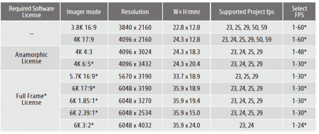 可拍攝3.8K-6K規格畫面(如上圖)、全片幅36x24mm搭配CMOS 感光元件、15檔動態範圍、8段式ND瀘鏡支援super 35mm鏡頭、全片幅PL口電影鏡頭、E口鏡頭。檔案格式為X-OCN檔、4K XAVC檔、ProRes HQ/422/LTMPEG HD,檔案可以直接進入DaVinci Resolve或是Sony Roth Viewer軟體進行調色。